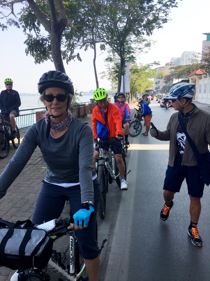 Yesterday we were pedestrians dodging motorbikes and cars on crowded Hanoi streets, and today we set out to see the city by bike. We are a diverse group of six people – 4 men and 2 women. Two Brits (one originally from New Zealand), one Canadian (by way of Denmark), and one Australian in addition to Barry and me. Our leader, Nguyen Son (Son), lives in Hanoi when he’s not shepherding tourists around his country.