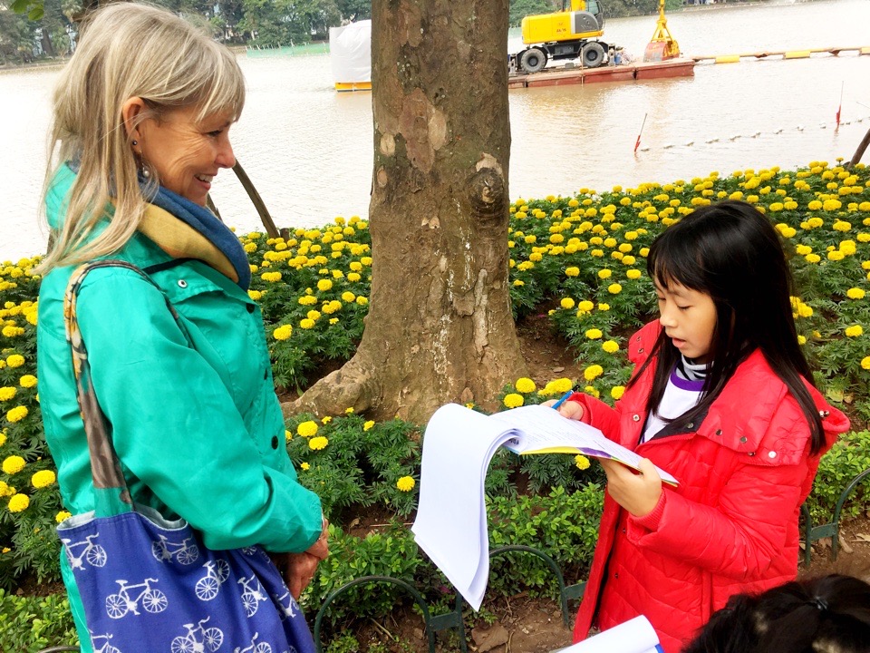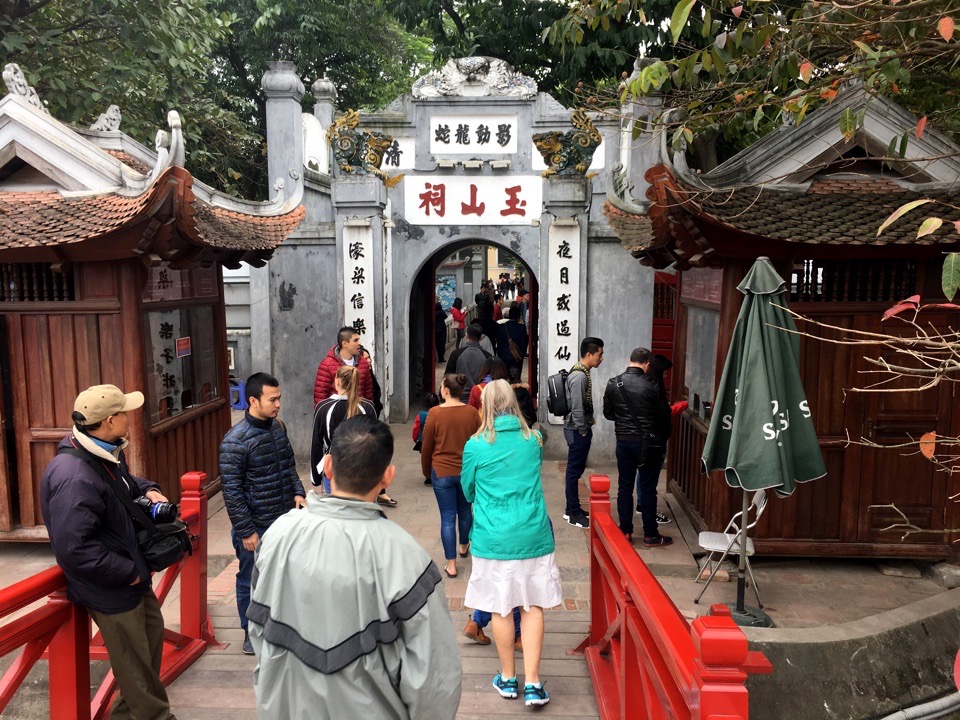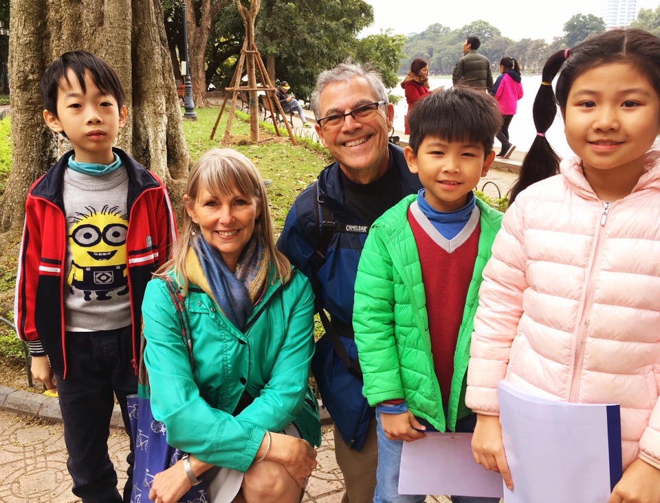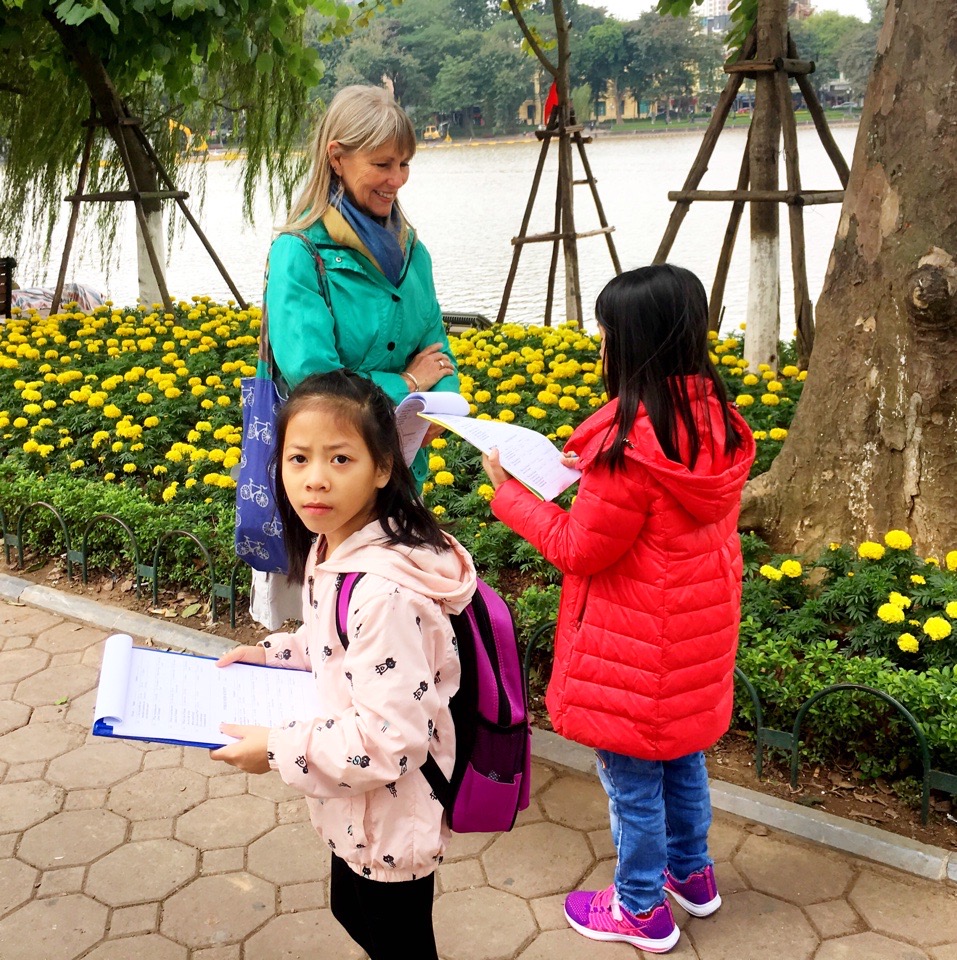 The cacophony of the street contrasted with the pleasantness of Hoan Kiem Lake, a popular respite in the center of the Old Quarter where the streets are blocked off on weekends, creating a safe haven for pedestrians. We were stopped multiple times by children wanting to practice their English. Most had a script of questions they asked, writing down our answers or marking them on a checklist.