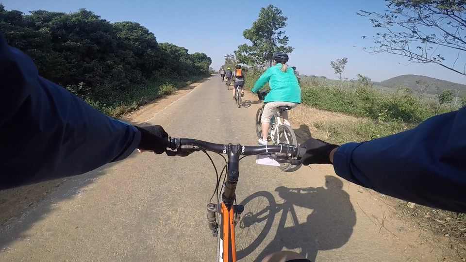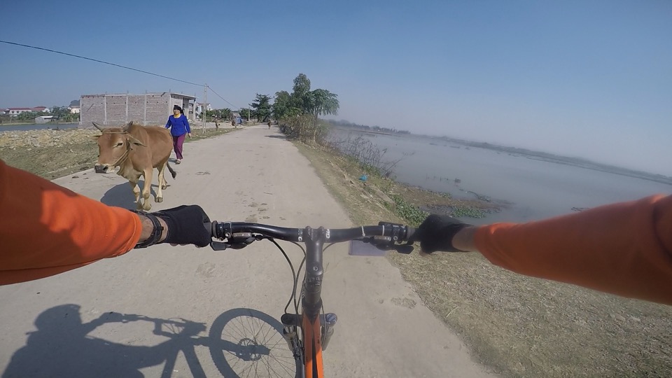 Dodging potholes and water buffalo along the rural single lane paths requires quicker response time than hand signals allow. The water buffalo were everywhere this morning. And their size is formidable from a bike. Just as we were admiring a cluster of six or so on either side of our path, mom and her calf started running along beside us. Charming . . . until mom stepped into the path directly in front of me (Sharon) and looked me straight in the eye. Quick braking and dodging were required to avoid going face-to-face with those beautiful brown eyes and the wrath of a mom protecting her baby!